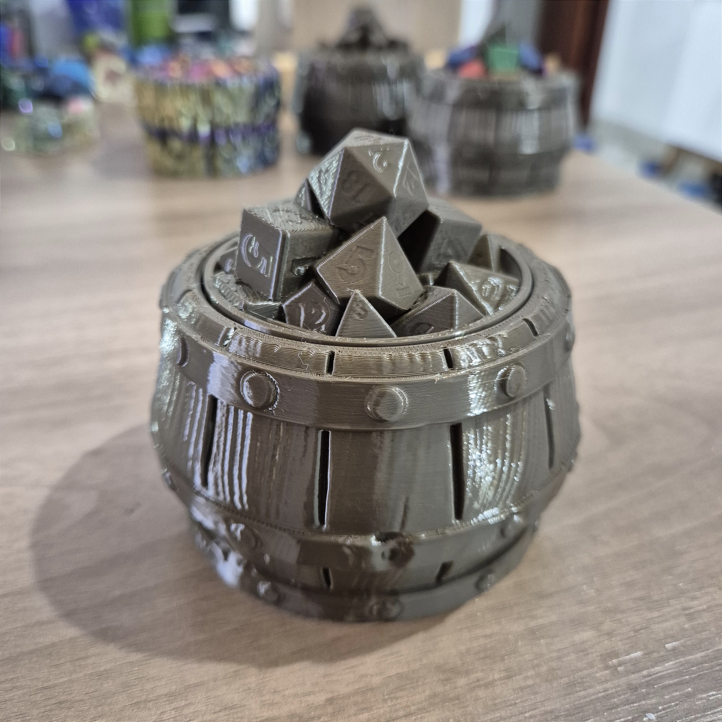 O Barril Porta-Dados é uma dice box temática, impressa em 3D, pensada tanto para uso em mesa quanto como item decorativo.