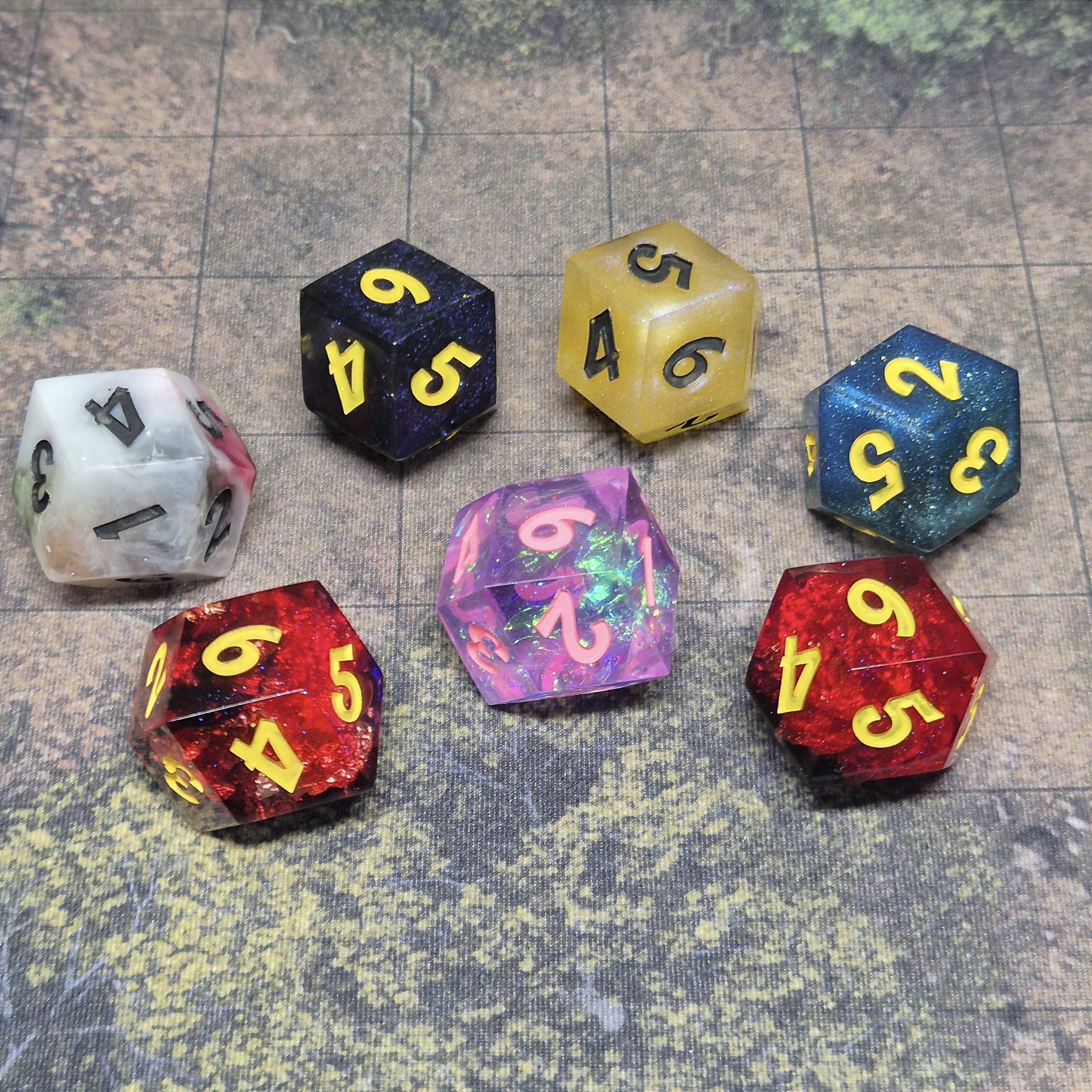 IMPORTANTE - DADOS HANDMADE: Todos os dados são feitos à mão e, como tal, podem ter pequenas falhas. Normalmente são uma pequena marca na face inferior de qualquer dado e / ou o dado não ter uma forma geométrica perfeita.Tais questões não afetam o lançamento do dado (a menos que seja indicado), pois nossos kits são forjados sob pressão. Mas quero ser totalmente transparente sobre elas! Além disso, esses dados não podem ser usados como munição em estilingue... ou podem! Mas cuidado! Pode machucar ^^